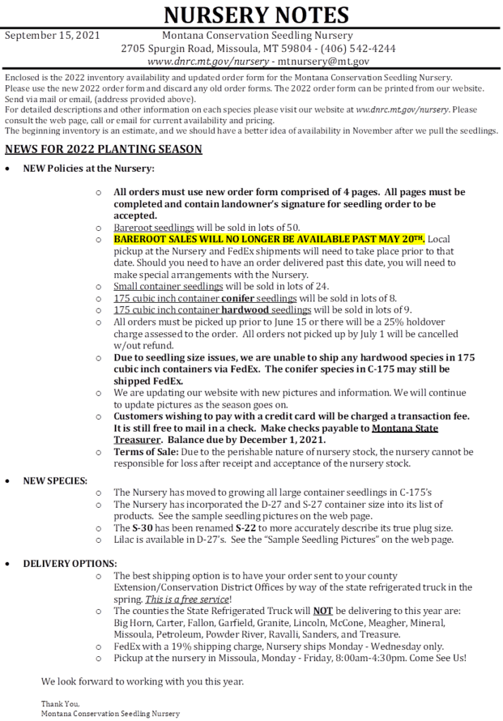 The Montana Conservation Seedling Nursery is offering plants for conservation projects from locally adapted seedlings again this year. For more information, read through the form below or visit their website: https://dnrc.mt.gov/Forestry/Conservation-Nursery/