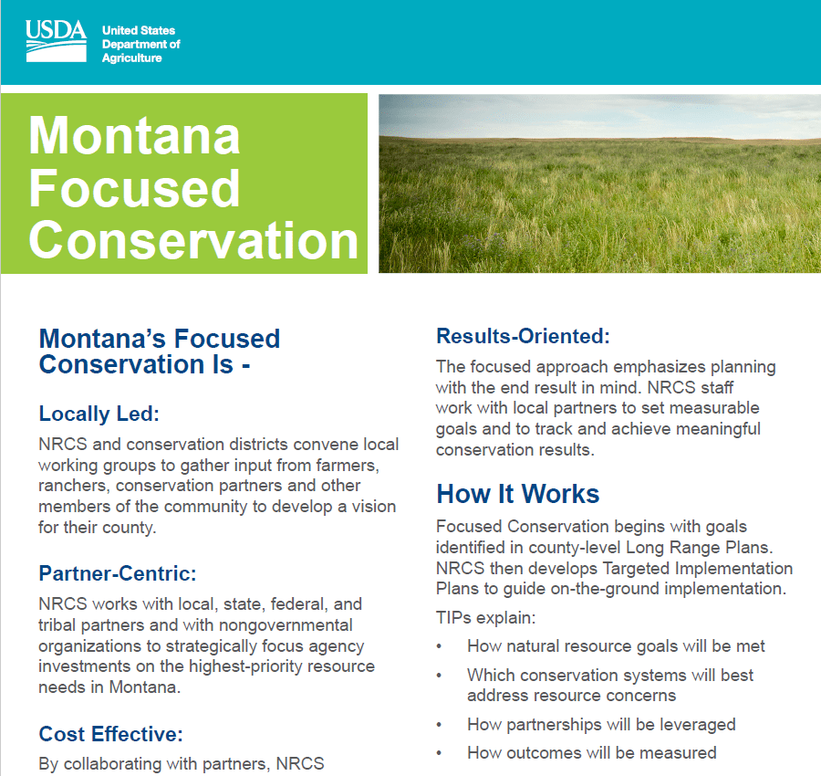The Natural Resources Conservation Service’s (NRCS) goal of Montana Focused Conservation is to focus conservation investments in targeted areas to achieve clearly defined natural resource outcomes on a broader landscape as identified by local landowners and partners through the locally led process.