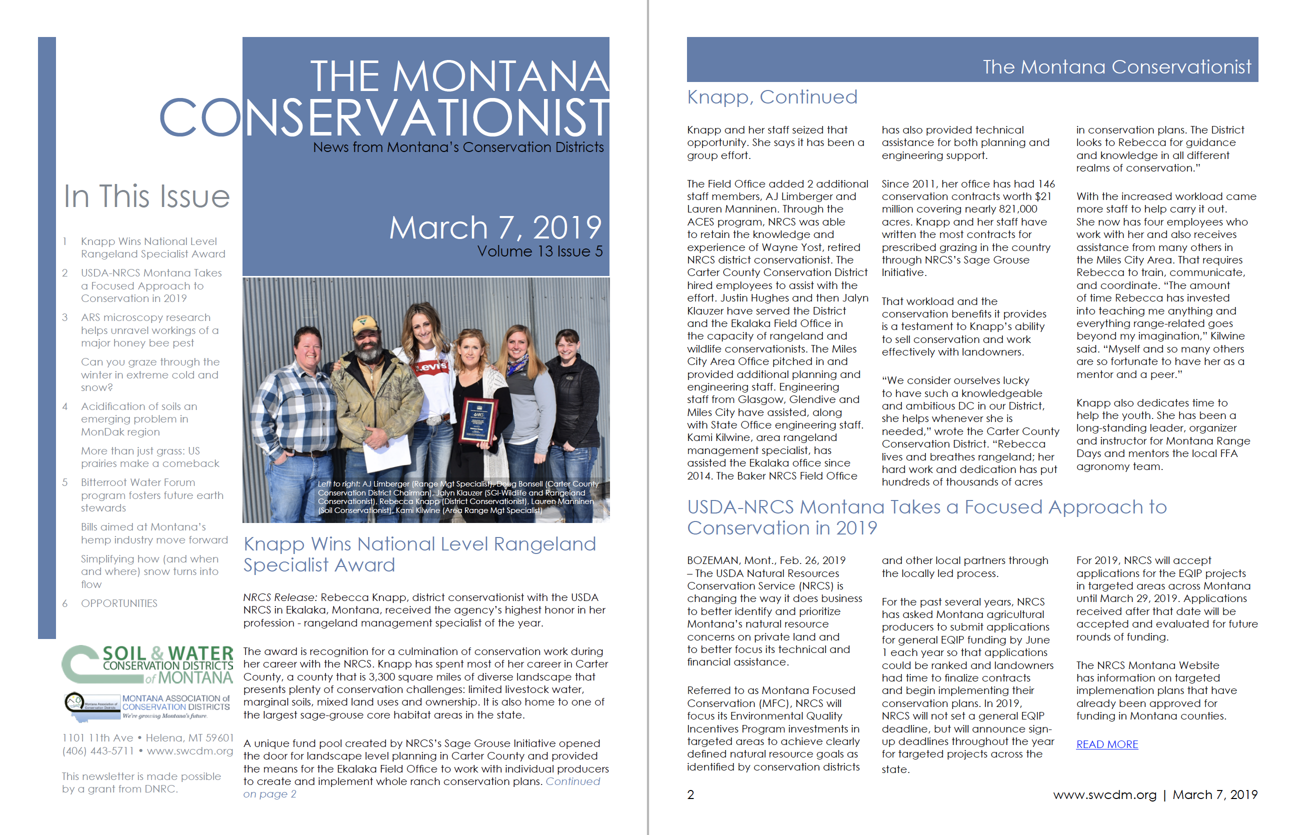 - And in other NRCS news, Montana is taking a “focused approach” to conservation initiatives. Each county will leverage local working groups to develop a focus for targeted EQIP projects. Conservation Districts can play a big role in this by helping the lead the local working groups.